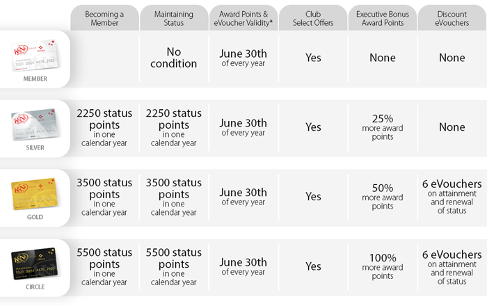 A higher status of Silver, Gold or Circle within the Club also entitles you to an Executive Bonus on award points earned, even for the same purchase amount. If you have Silver status, you earn 25%. Gold status entitles you to 50%, while Circle status gives you 100% Executive Bonus. Executive Bonus is not applied on Status Points.